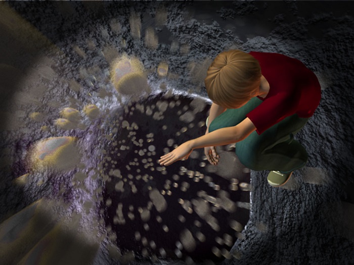 Τέλος, στην πράσινη αίθουσα, ο επισκέπτης διασχίζει ένα δάσος από σταλακτίτες για να καταλήξει να κάνει τη δική του, εικονική γεώτρηση.